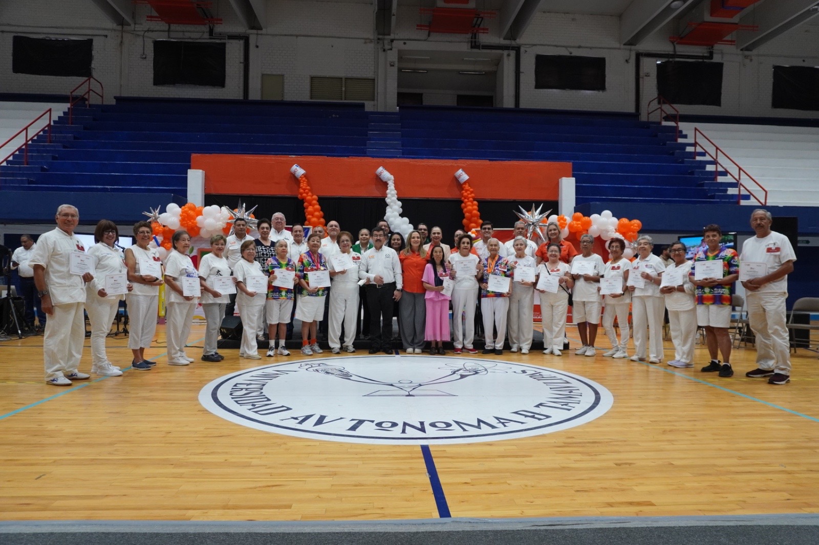 El evento reunió la entusiasta colaboración de integrantes del Club de la Edad de Oro del Gimnasio Multidisciplinario de Tampico, que participaron en esta actividad junto al rector, MVZ Dámaso Anaya Alvarado, y su esposa, Lic. Isolda Rendón de Anaya, presidenta de Familia UAT.