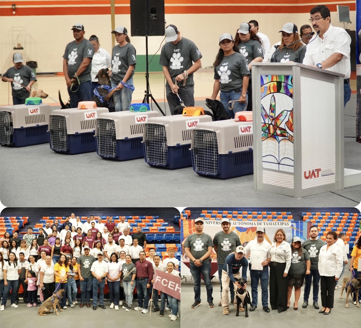 En emotiva ceremonia, el rector de la Universidad Autónoma de Tamaulipas (UAT), MVZ Dámaso Anaya Alvarado, presidió la entrega en adopción de diez perros retirados de corporaciones de seguridad y auxilio, a familias tamaulipecas que les brindarán los cuidados y la atención que merecen.