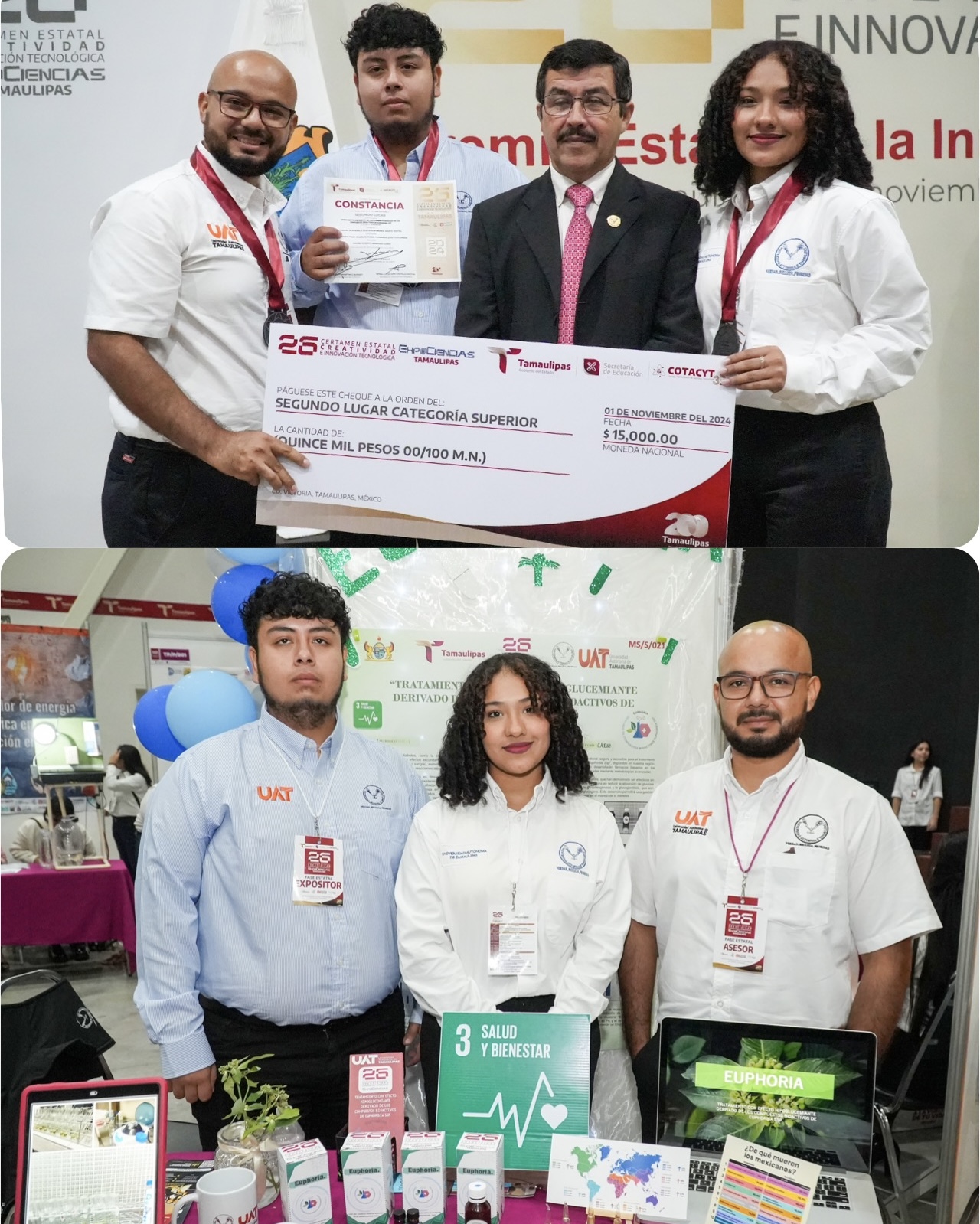 En el marco del evento celebrado en esta capital, los jóvenes y su asesor recibieron el premio de manos del gobernador Américo Villarreal Anaya, acompañados por el rector de la UAT, Dámaso Anaya Alvarado, quien los felicitó por este importante logro.