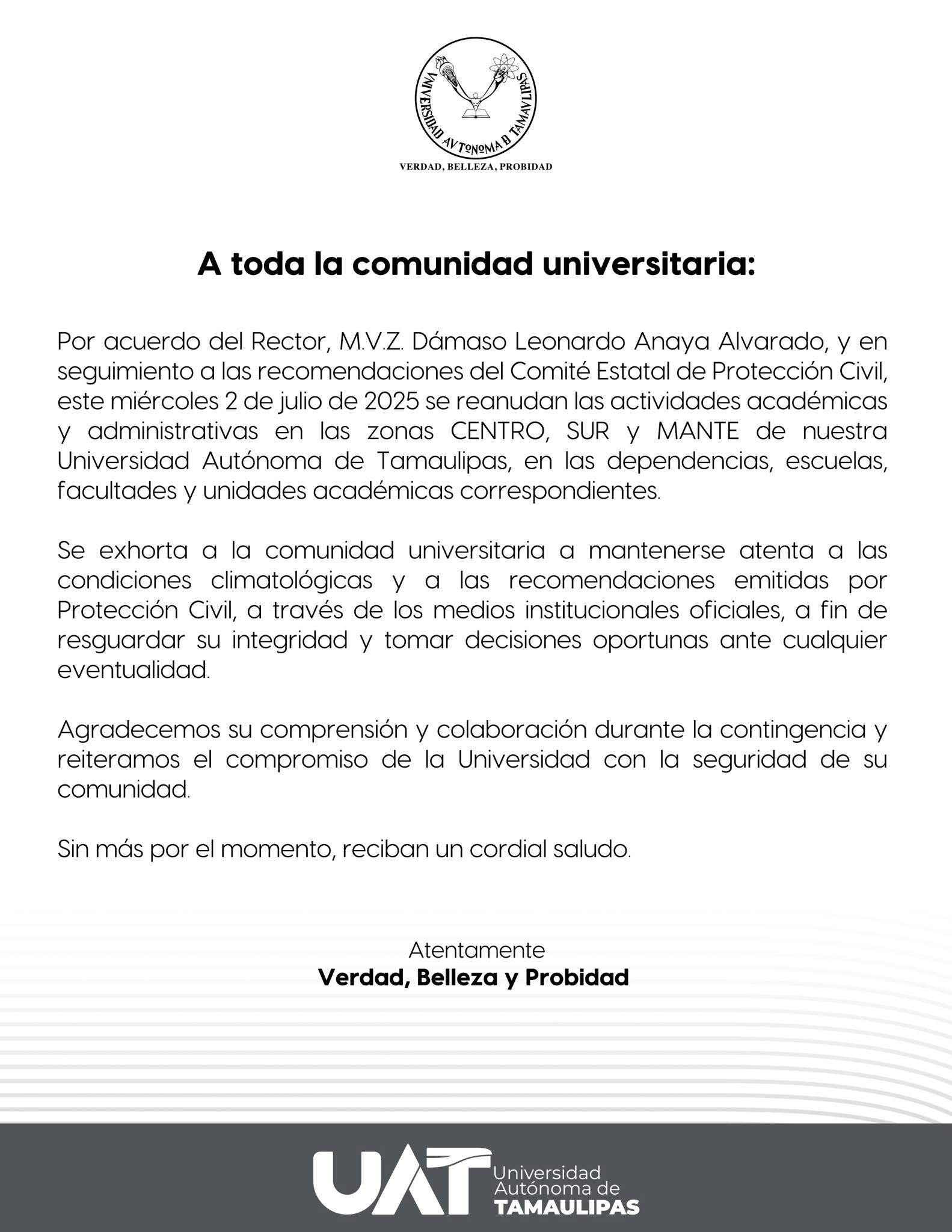 Este miércoles 2 de julio de 2025 se reanudarán las actividades académicas y administrativas en las zonas Centro, Sur y Mante de la UAT, conforme a las recomendaciones del Comité Estatal de Protección Civil.